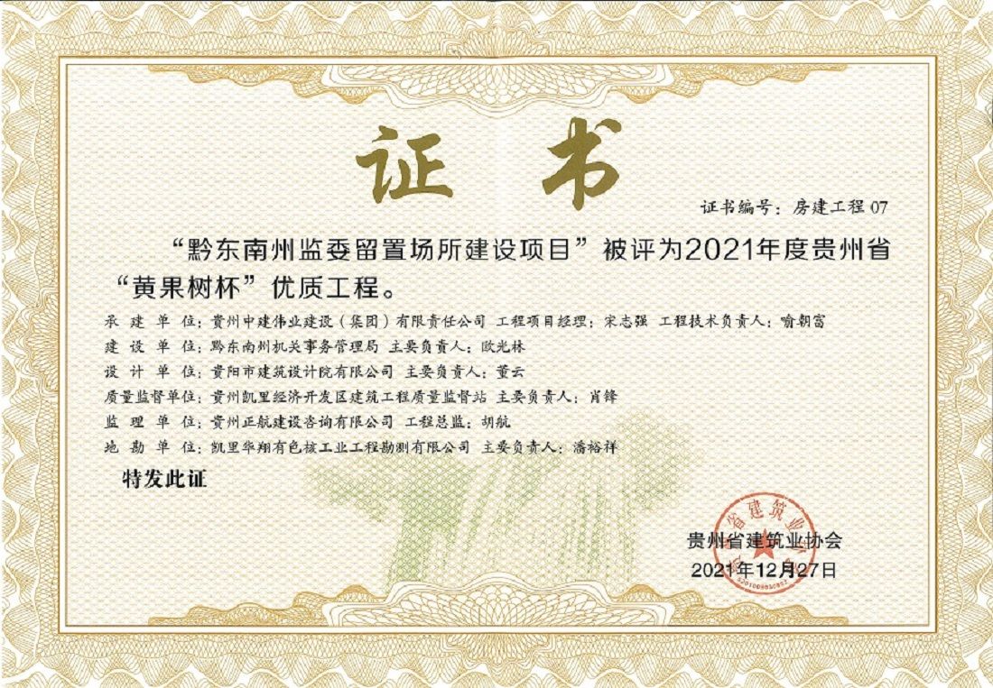 据悉,,,,,,“黄果树杯”是贵州省建设工程施工质量方面的最高声誉奖,,,,,,每年评选一次,,,,,,2021年度仅有14项工程获得“黄果树杯”优质工程奖,,,,,,“黔东南州监委留置场合建设项目”在众多优异项目中脱颖而出,,,,,,斩获殊荣,,,,,,再一次展现了集团公司在质量治理、项目履约、品牌打造等方面扎实的业绩实力和优异的企业形象。。。。。。