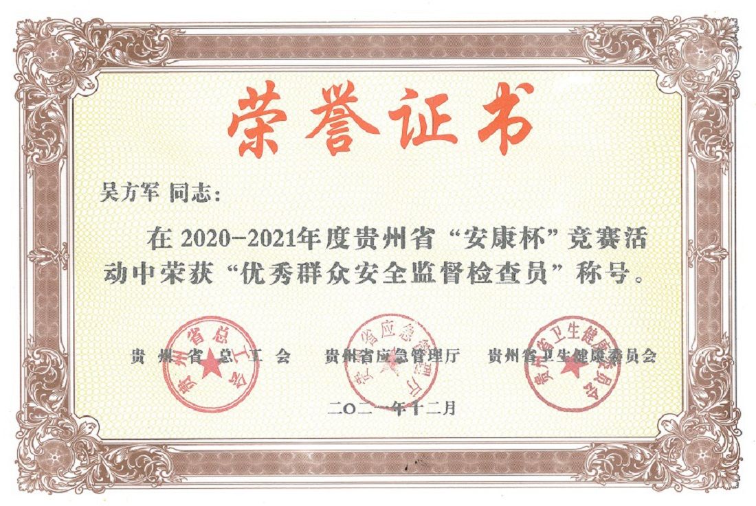 同时,,,,,集团公司吴方军同志在该次评选中荣获“贵州省优异群众清静监视检查员”称呼。。。。。