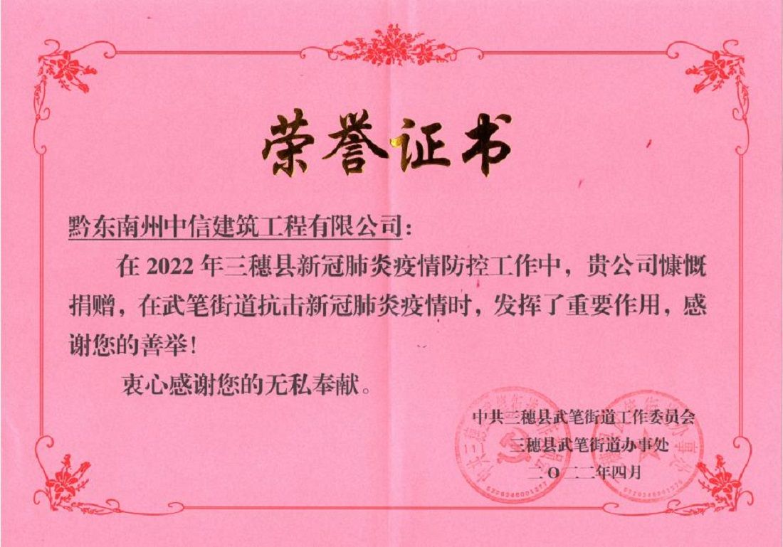 今年3月,,,,,,,,黔东南中信修建工程有限公司为助力三穗县疫情防控事情,,,,,,,,向三穗县相关单位捐赠防疫生涯物资合计金额3万余元,,,,,,,,在三穗县疫情防控事情中施展了起劲作用。。。。。。。这份声誉,,,,,,,,是武笔街道对中信公司推行社会责任的高度认可。。。。。。。