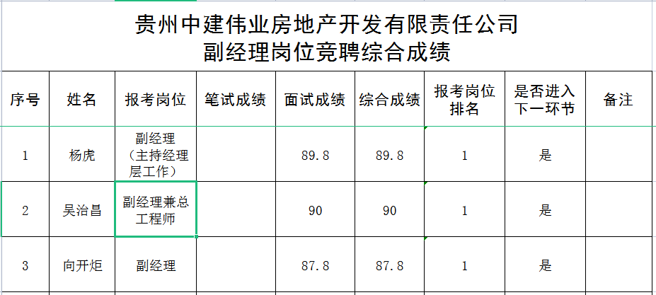 贵州中建伟业房地产开发有限责任公司2022副司理岗位竞聘综合效果名单公示
