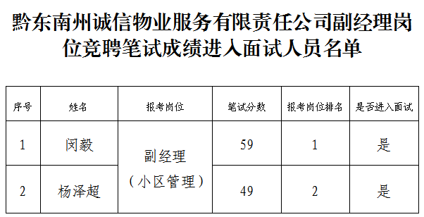 黔东南州诚信物业效劳有限责任公司副司理岗位竞聘笔试效果及进入面试职员名单公示
