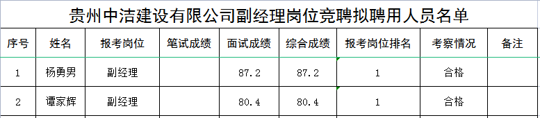 附件:贵州中洁建设有限公司副司理岗位竞聘拟聘用人员名单