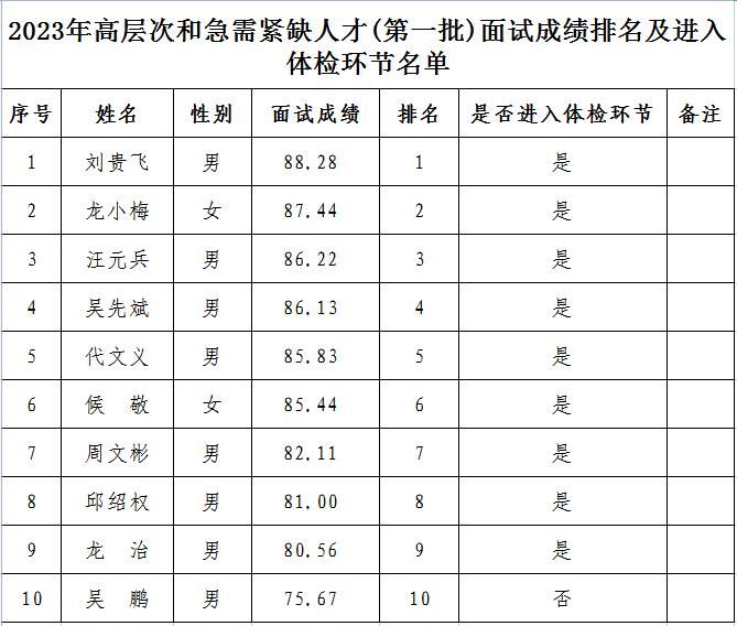 附件:2023年高条理和急需紧缺人才(第一批)面试效果排名及进入体检环节名单