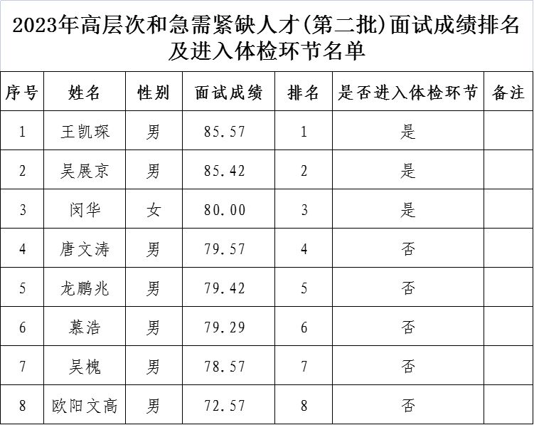 附件:2023年高条理和急需紧缺人才(第二批)面试效果排名及进入体检环节名单