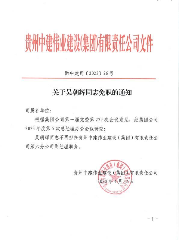 关于吴朝辉同志免职的通知